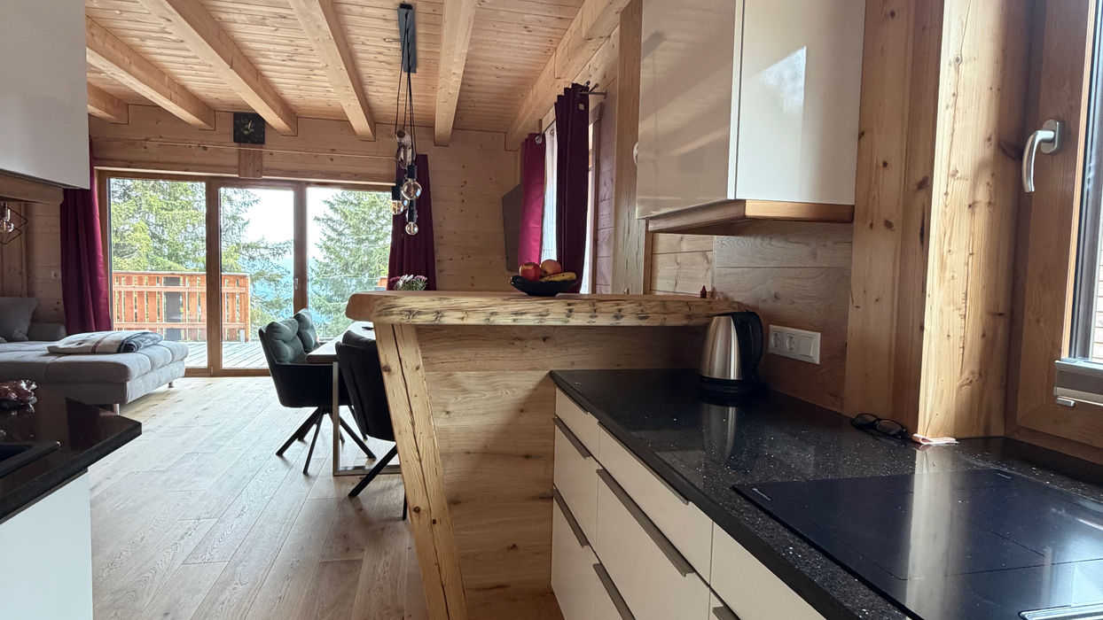 Die stilvoll gestaltete Almhütte bietet Platz für bis zu 6 Personen und verfügt über zwei gemütliche Schlafzimmer, einen großzügigen Wohn- und Essbereich mit komfortabler Couch sowie eine moderne Designer-Küche mit hochwertiger Steinplatte.